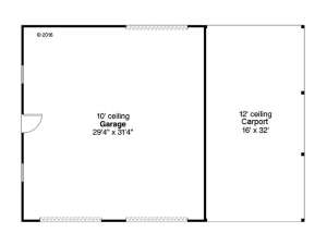 Traditional, detached, two-car garage plan with carport blends well with a variety of homes