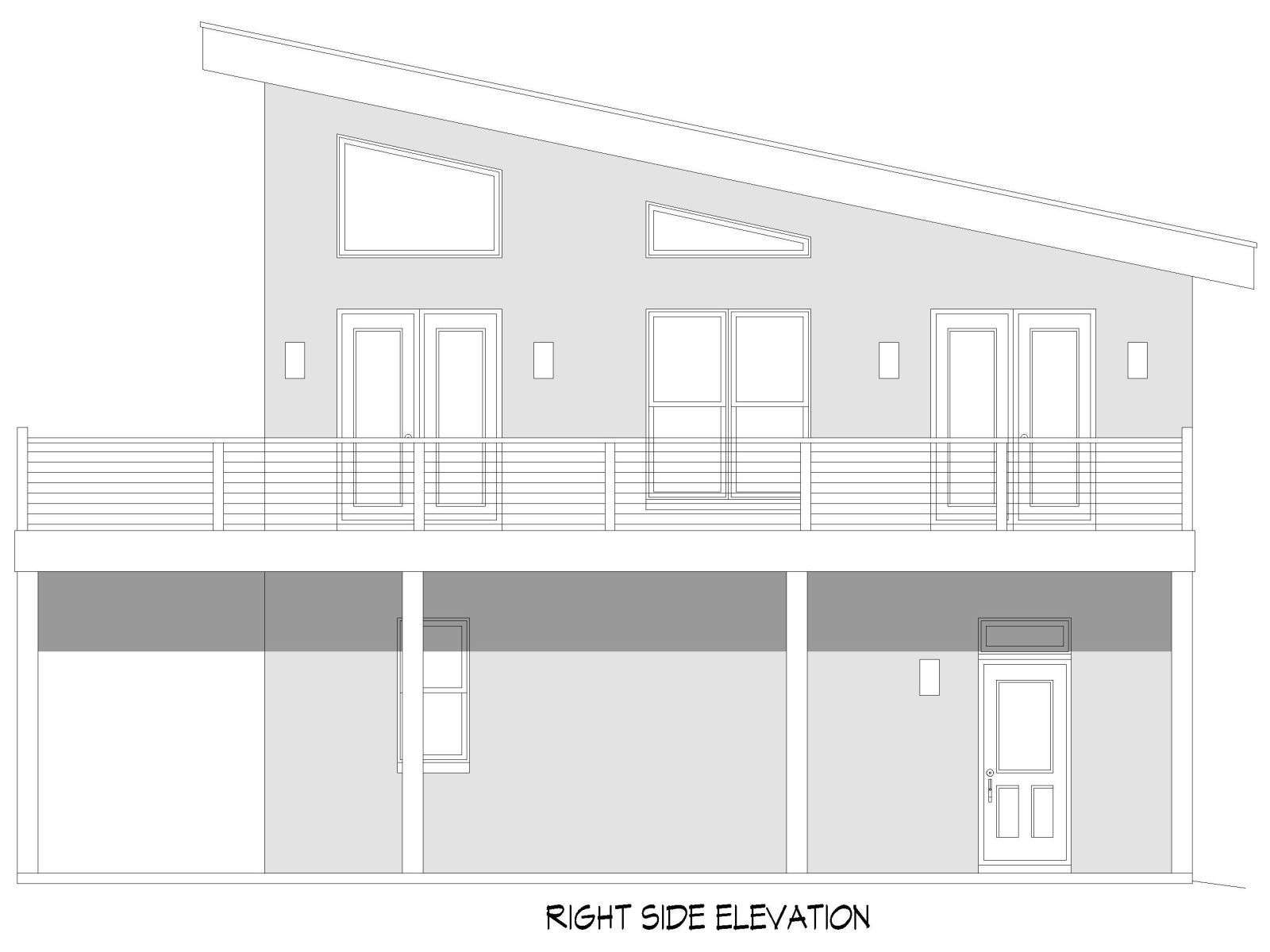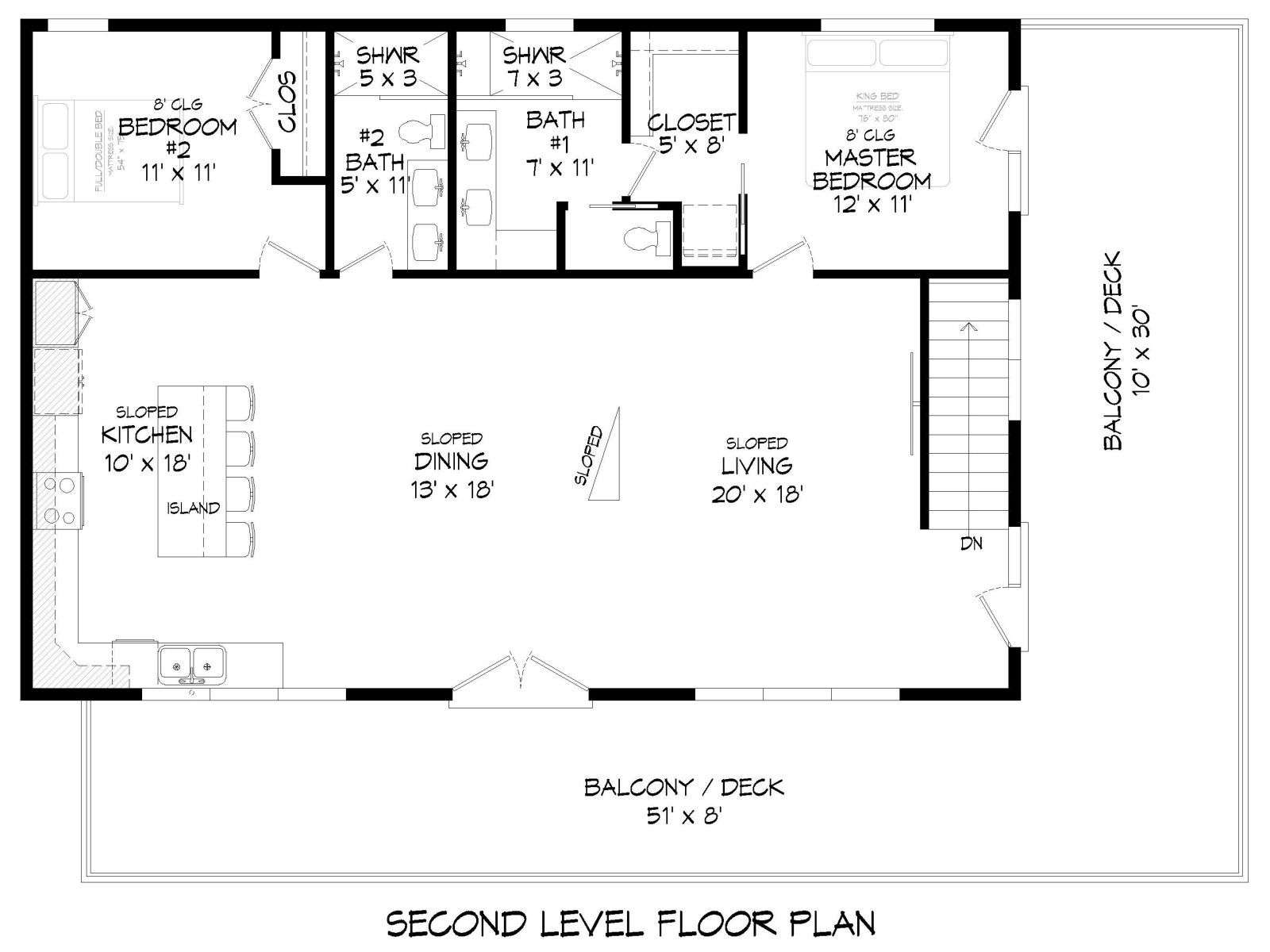 Ceiling above Living and Kitchen slopes from 8'-0" height to 14'-0" height.